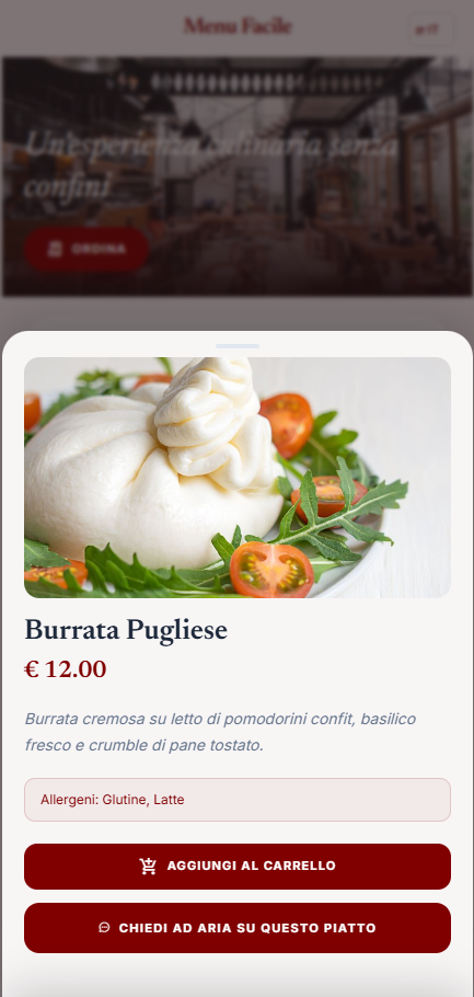 Allergeni, abbinamenti vino, consigli sul piatto. Aria conosce il tuo menu a memoria e parla automaticamente la lingua del cliente — senza che tu faccia nulla.
