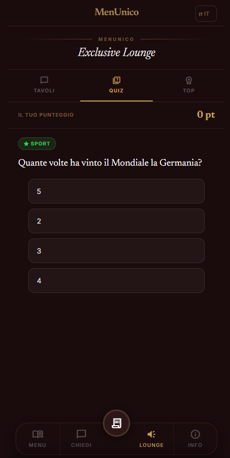 Chat anonima tra tavoli, quiz enologici, classifica della serata. La Lounge trasforma l'attesa in un'esperienza che si ricorda — e che fidelizza.